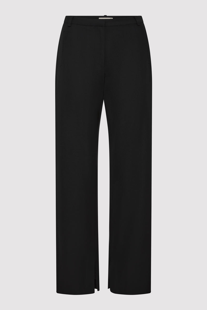 The 90s Split Leg Pants offer a sleek, understated silhouette. Designed with a low-waisted fit and straight-leg cut, the 90s Split Leg Pants fall effortlessly for a relaxed yet polished look. Pair with a simple basic or a matching blazer for refined yet elevated daily dressing.